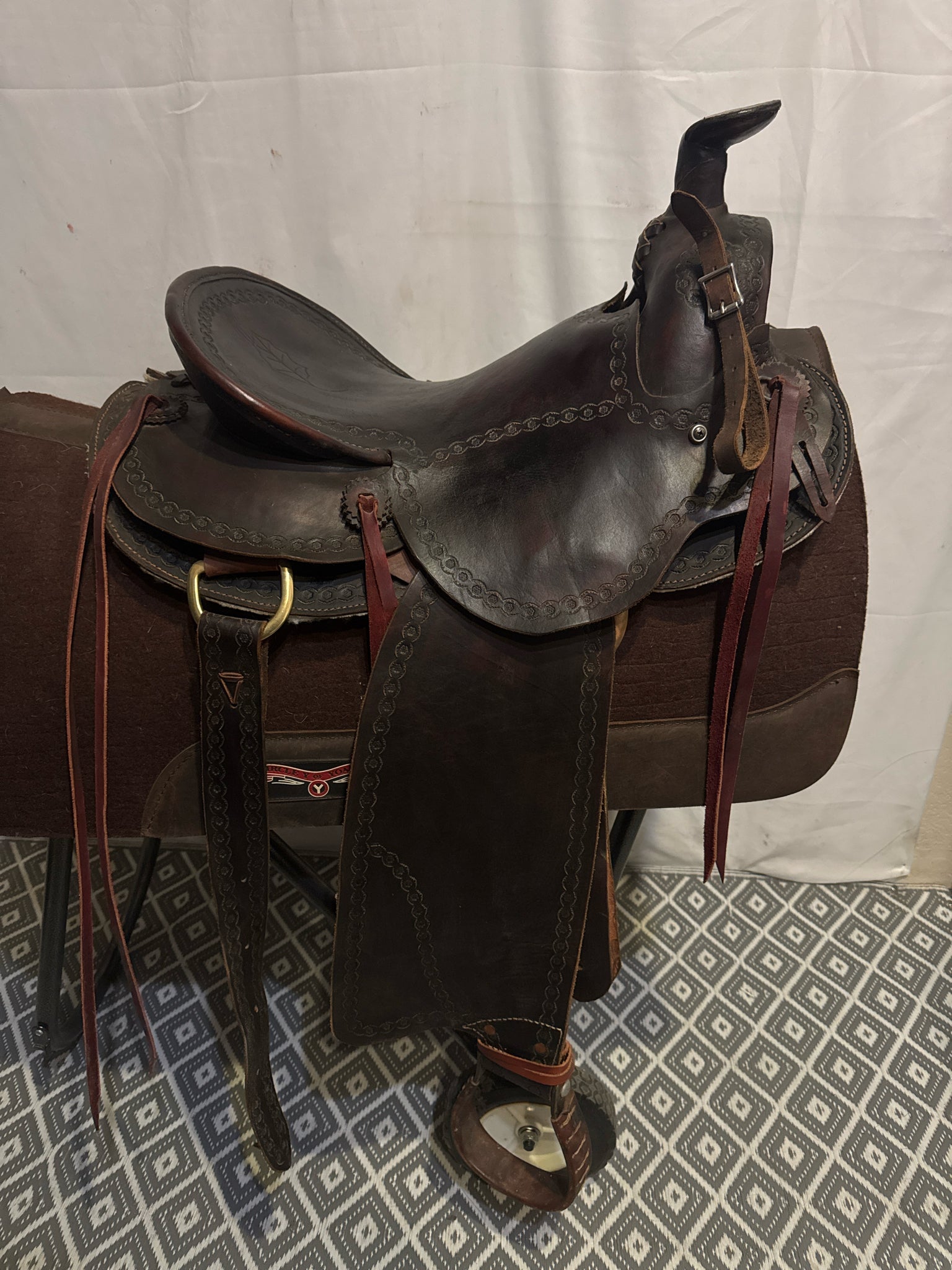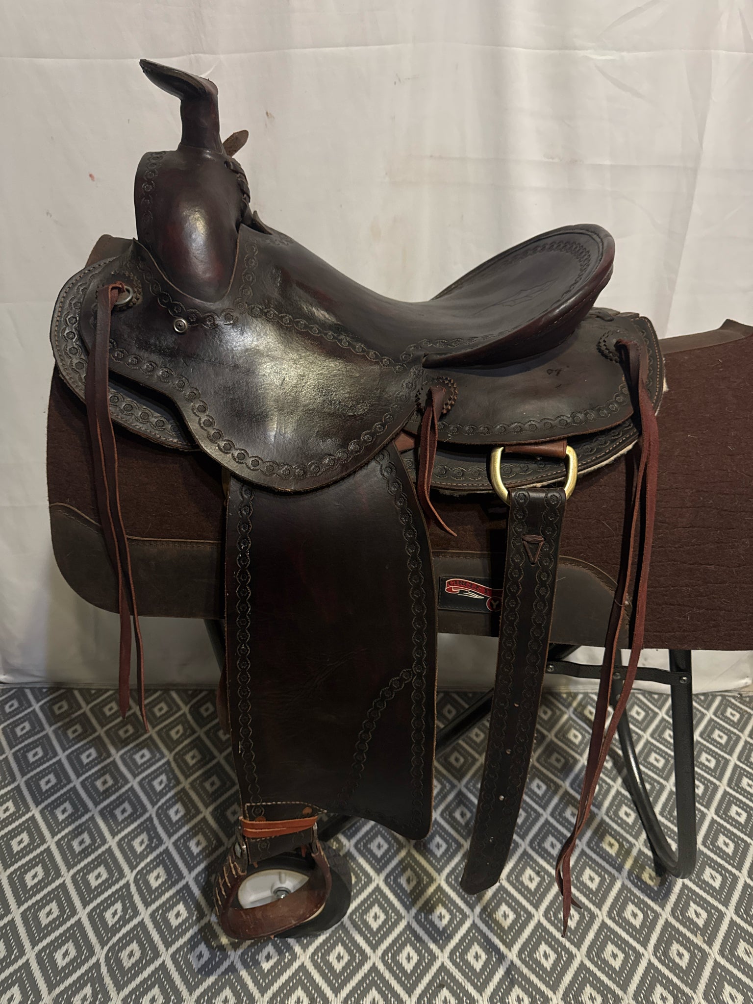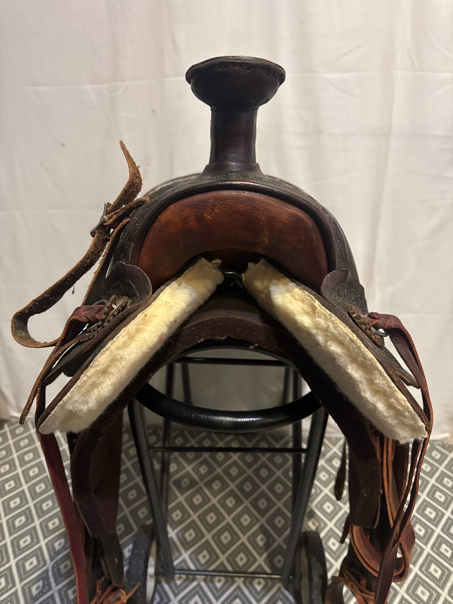 w/ back cinch. Has ties on fenders rather than traditional blevins.