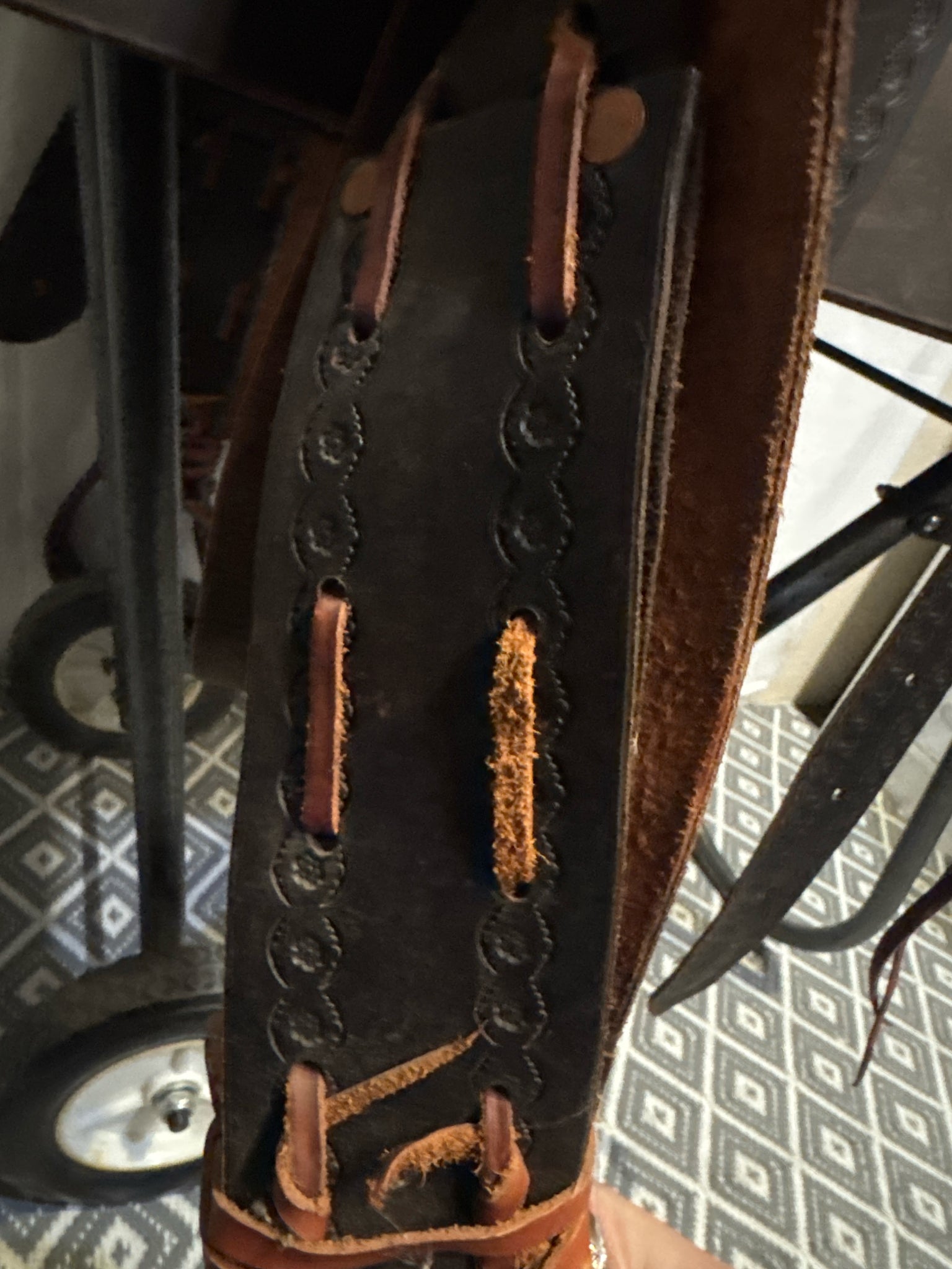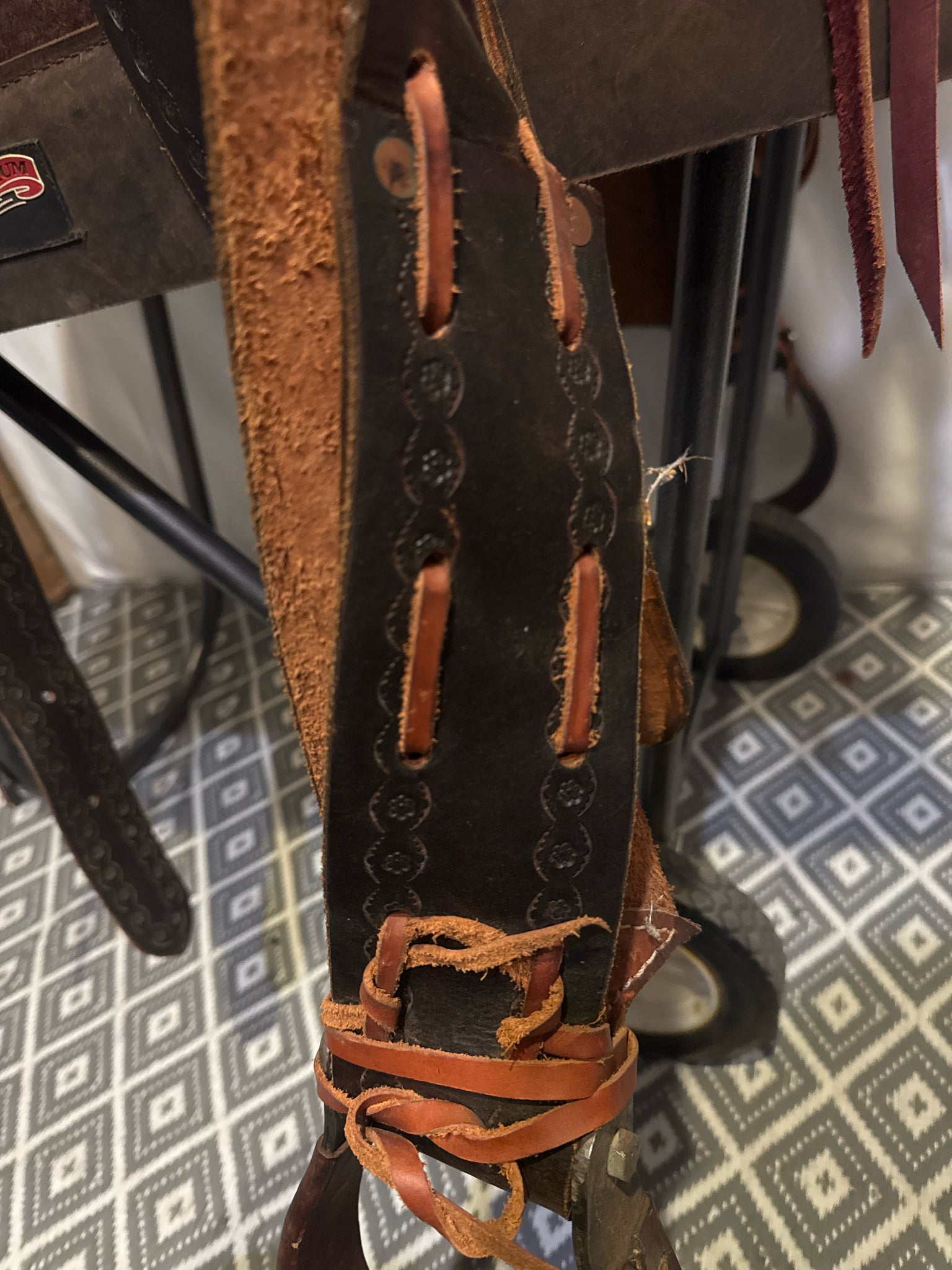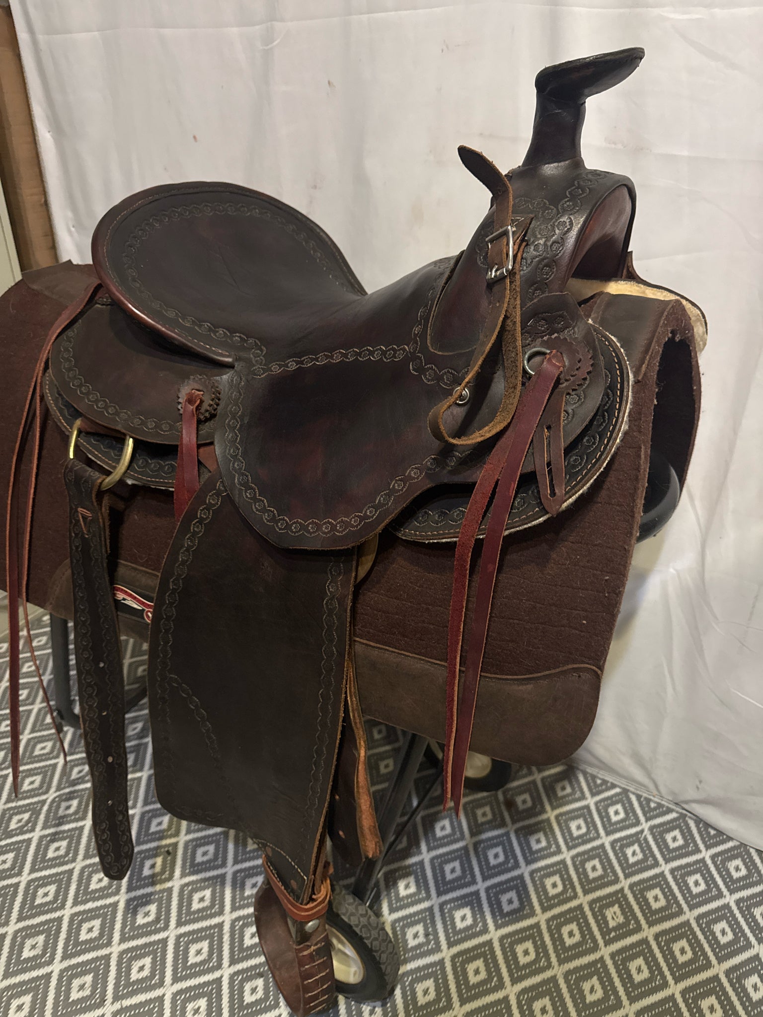 w/ back cinch. Has ties on fenders rather than traditional blevins.