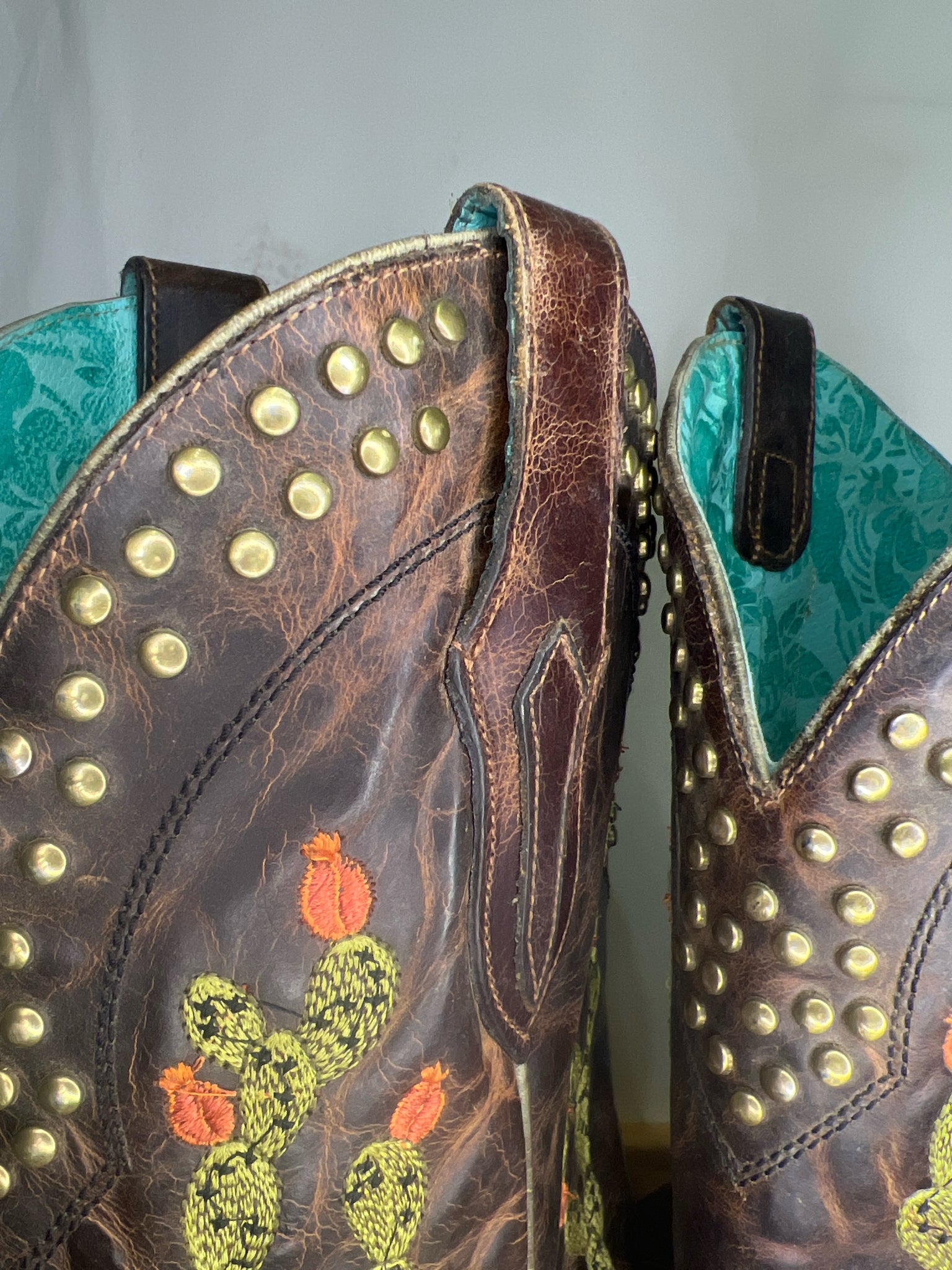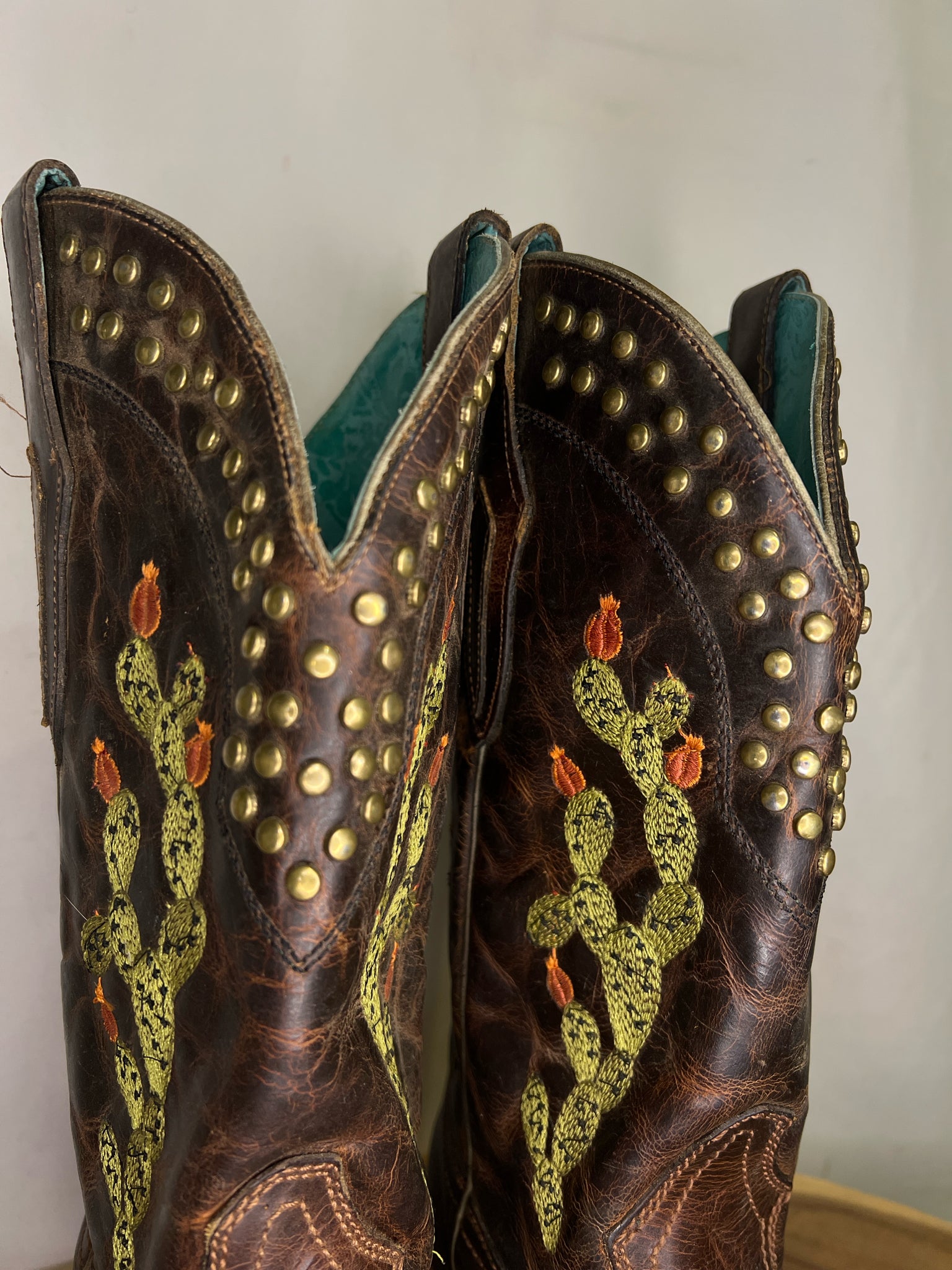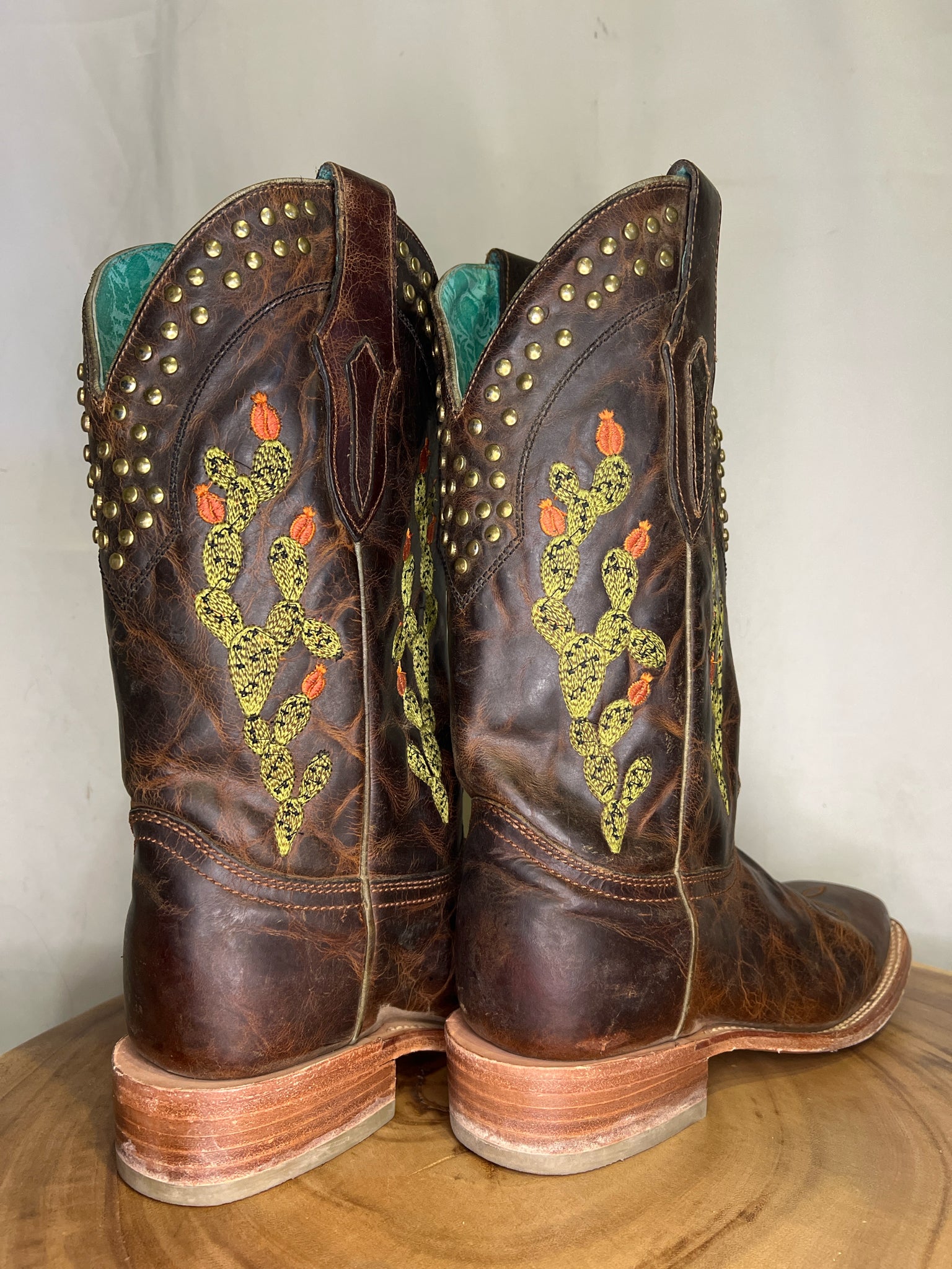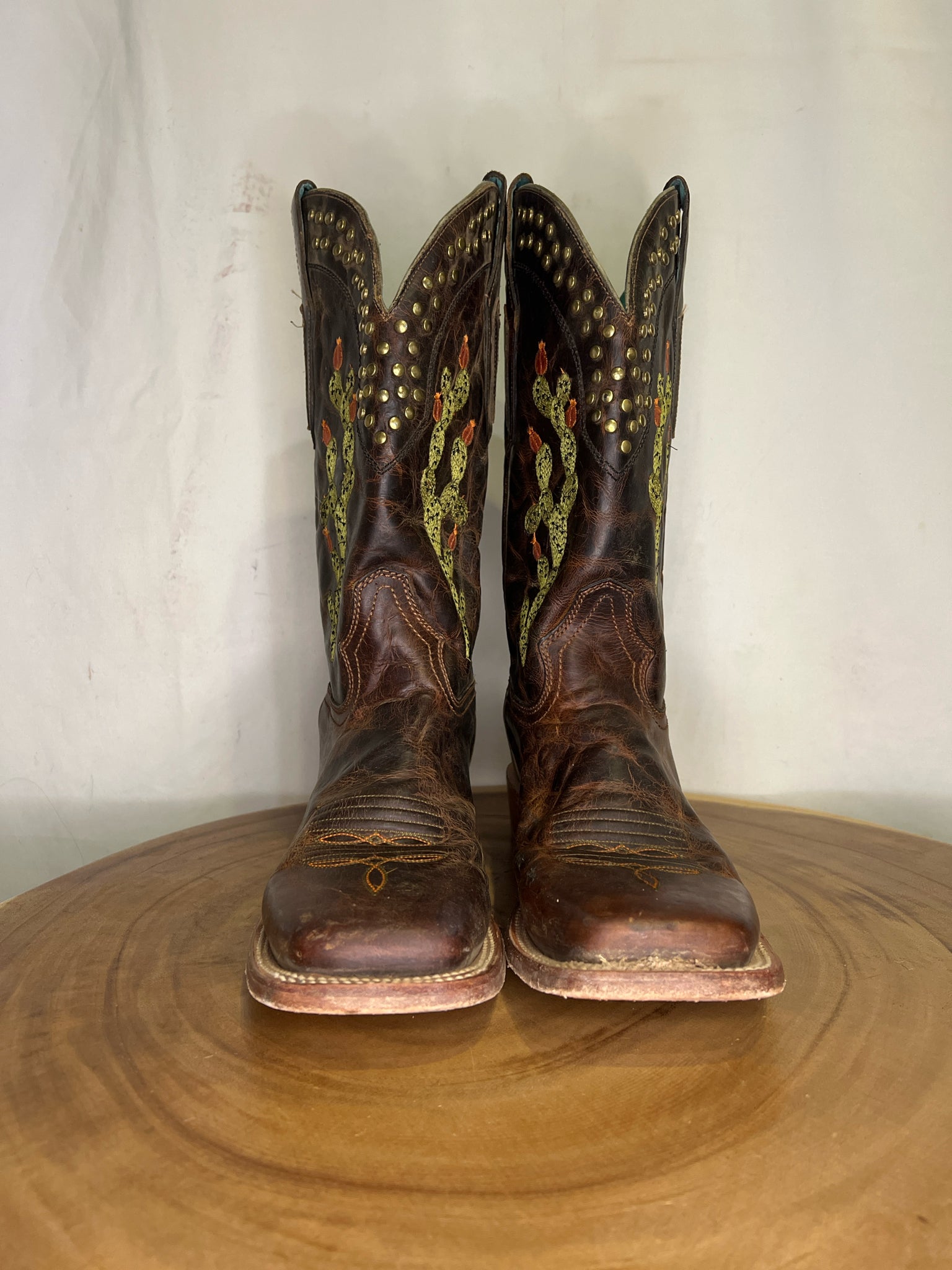 Brown Cactus Inlay and Embroidered with Studs Square Toe Boots