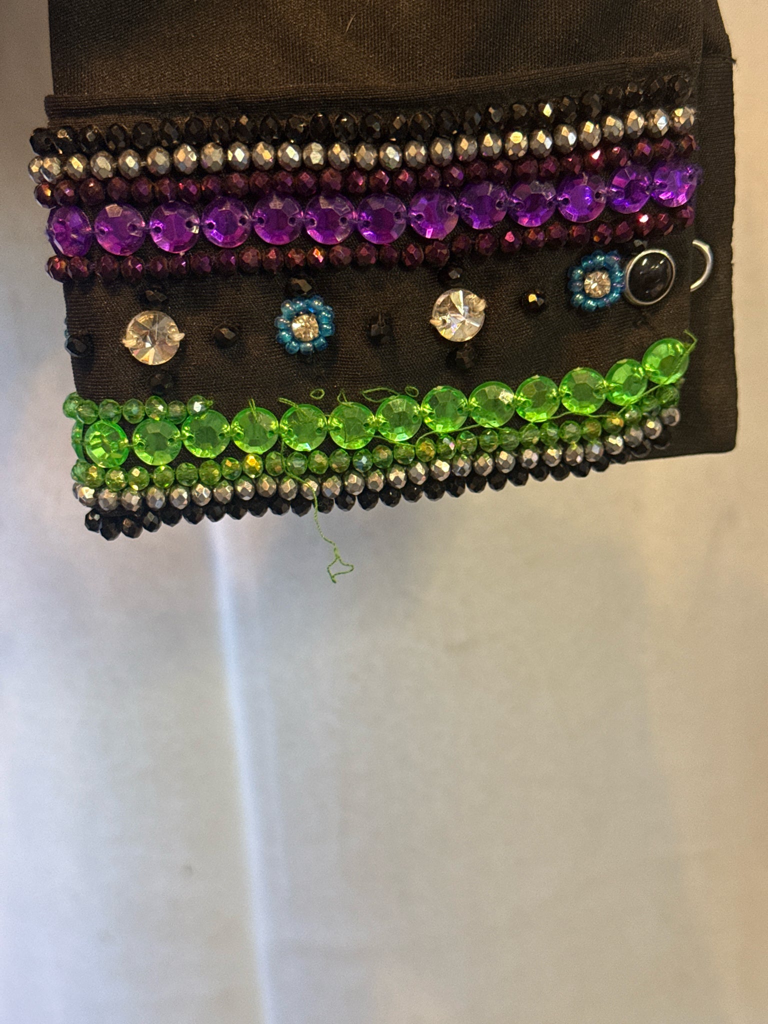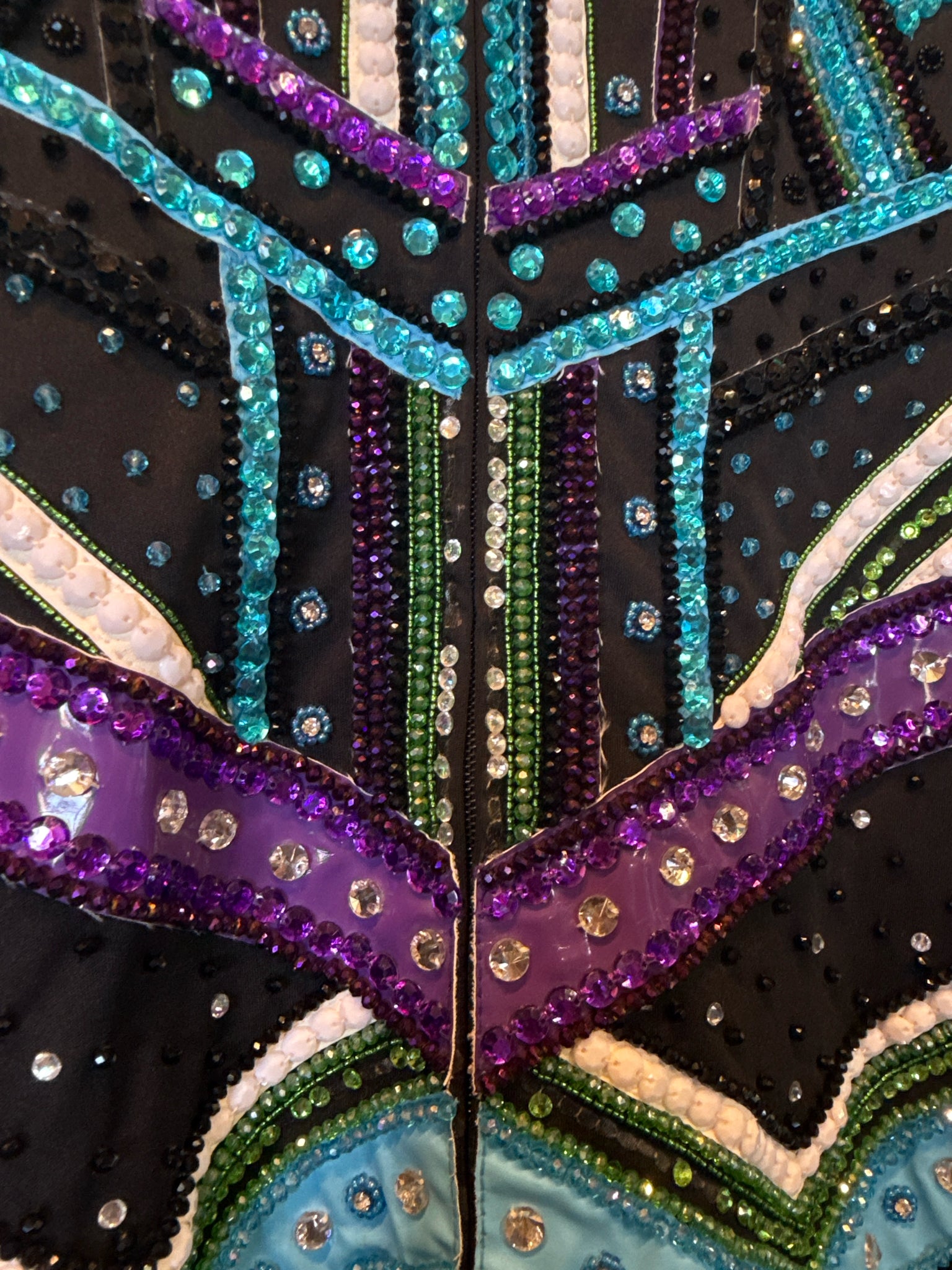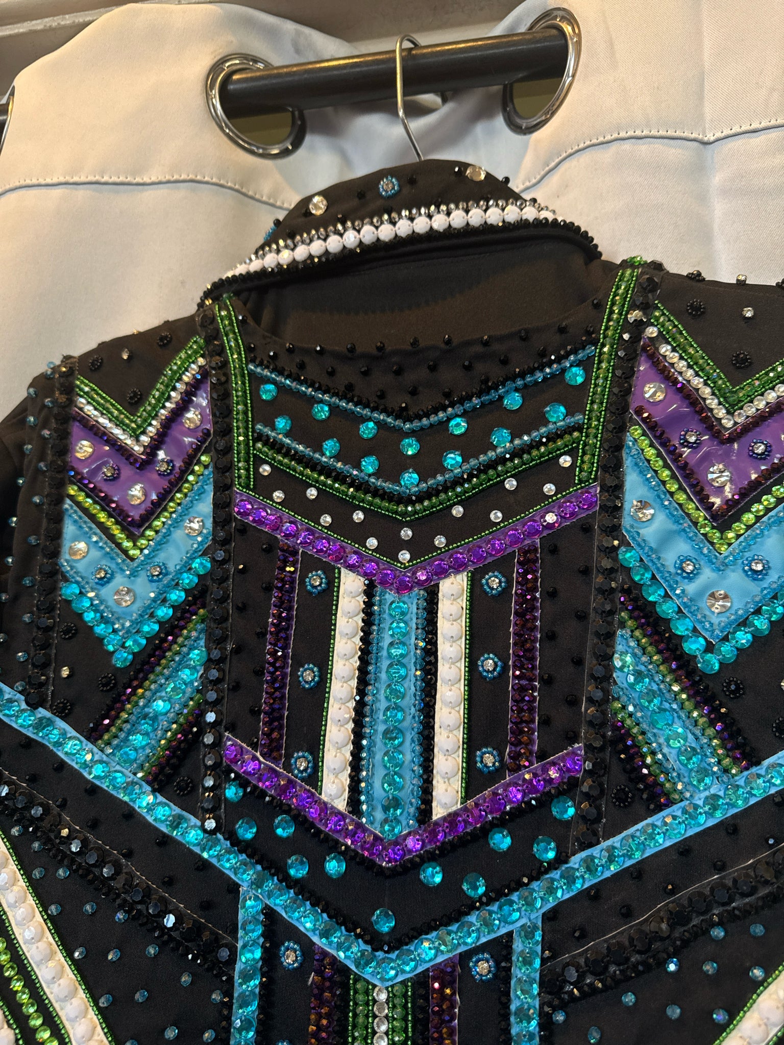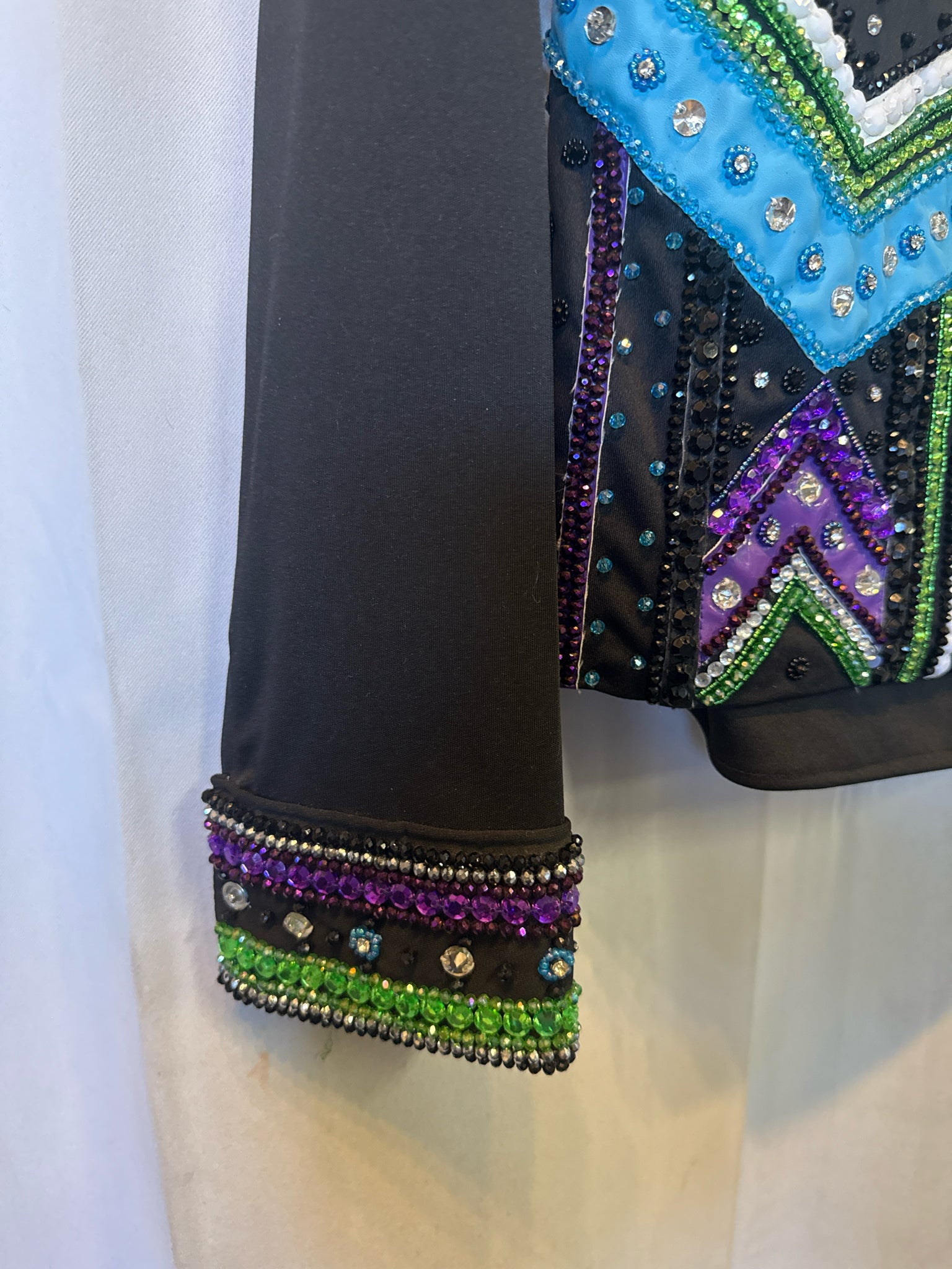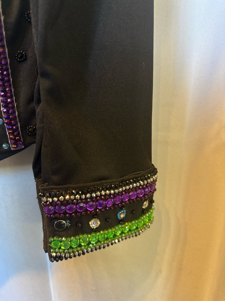 Some gems missing near zipper and on cuffs. With matching zip-up under shirt w/ hidden snap cuffs.